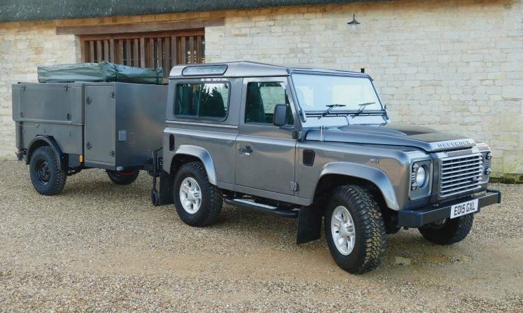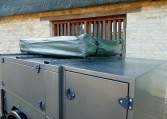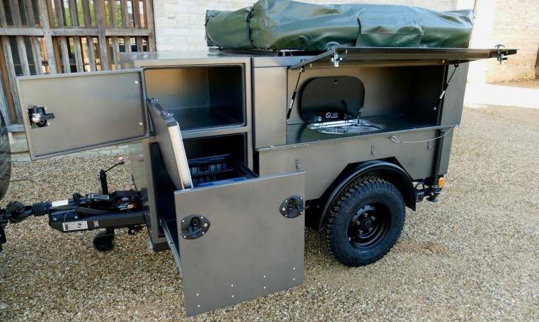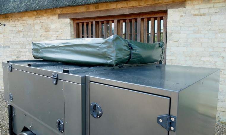 Specification includes; Land Rover HD wolf wheels with Michelin XZL tyres, Hydraulic Disc Brakes, anti roll bar, Auto Reverse, Swing away hi clear jockey wheel, Rear stabiliser legs, Multiple cargo tie down points, Stainless steel body, Fitted with NATO tow ring and lighting socket, Robust and Durable, GTW 1750 kg Laden, Unladen Weight 620kg, 1130kg Payload. We are able to offer an alloy removable pod that will drop on top of the trailer body with self contained alloy floor option with twin side doors to give great access to stow equipment and develop a camp kitchen out of the near side with further optional internal dividing wall. This solution gives you great versatility for summer camping trailer and once you have removed the pod a great trailer for general estate maintenance, DIY materiel transport through the rest of the year. We are also to offer a front 1 metre drawbar extension to add far more versatility and capacity to your trailer.