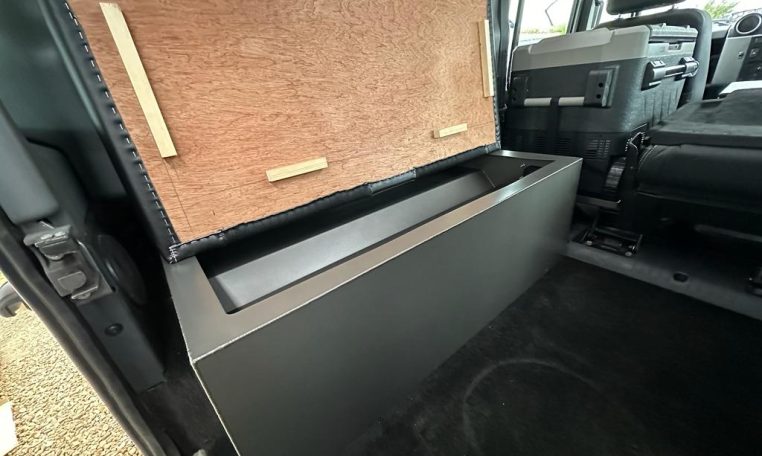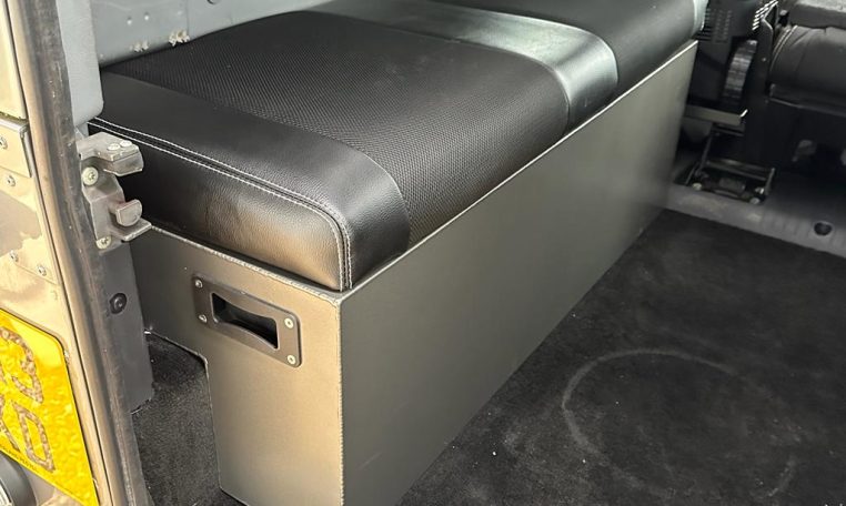 We have designed a snug fitting alloy seat box assembly that is held in place by a pair of over centre ratchet clips to enable easy removal for outside use or storage away from your Defender as to allow everyday use whilst not out there camping and exploring. The hand made seat is trimmed to match your Defenders existing interior, removable to access storage underneath. Finished in durable anthracite grey powder coating. Bespoke colours for seat box and seat cushion maybe available upon request at further cost. Base price. £1599+vat