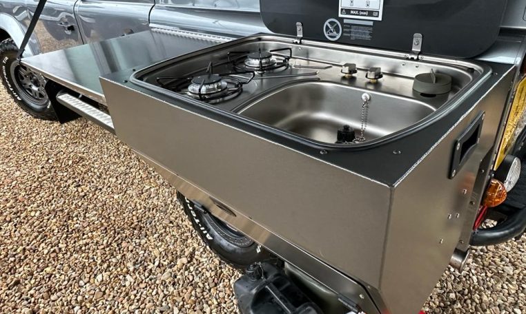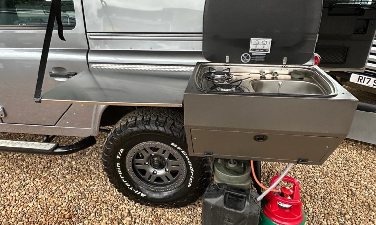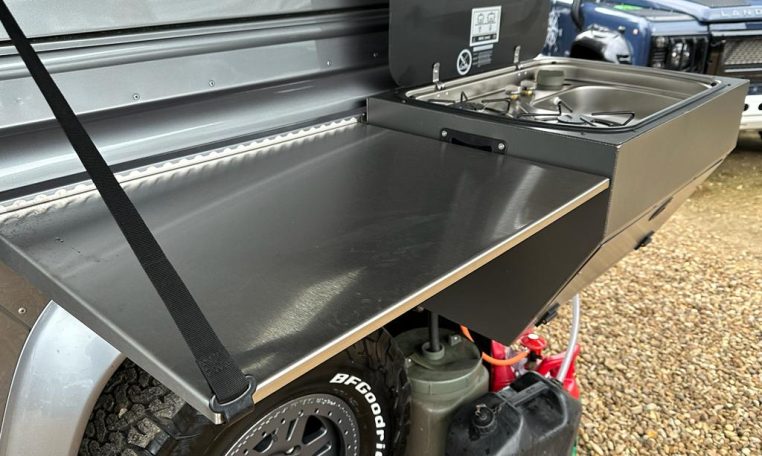 You may also wish to add our stainless steel cooker pod cover that covers while not in use, opens out to give you a food prep area and while closed and in transport mode in the back of your Defender is strong enough to load further storage box’s on top to aid efficient use of specs in the rear of your Defender while travelling. CamelbaC Cooker Pod price. £1899+vat