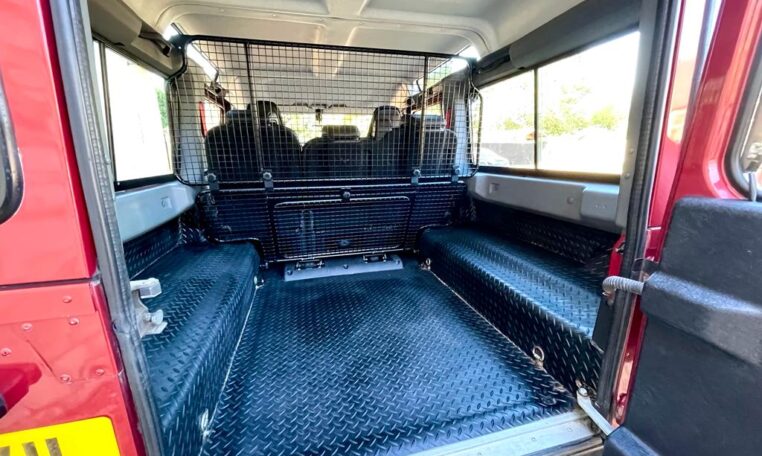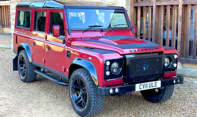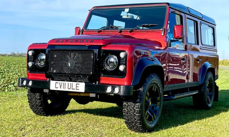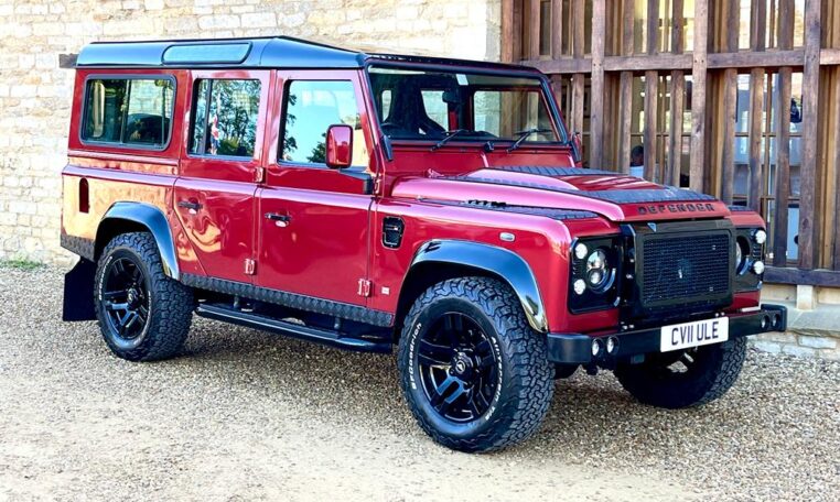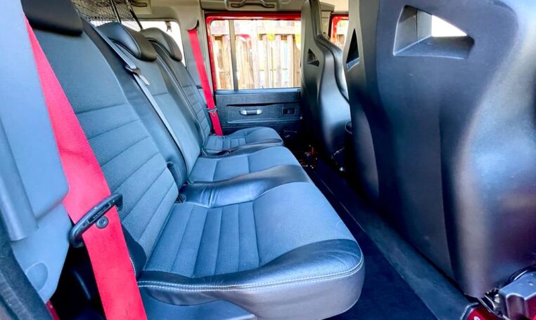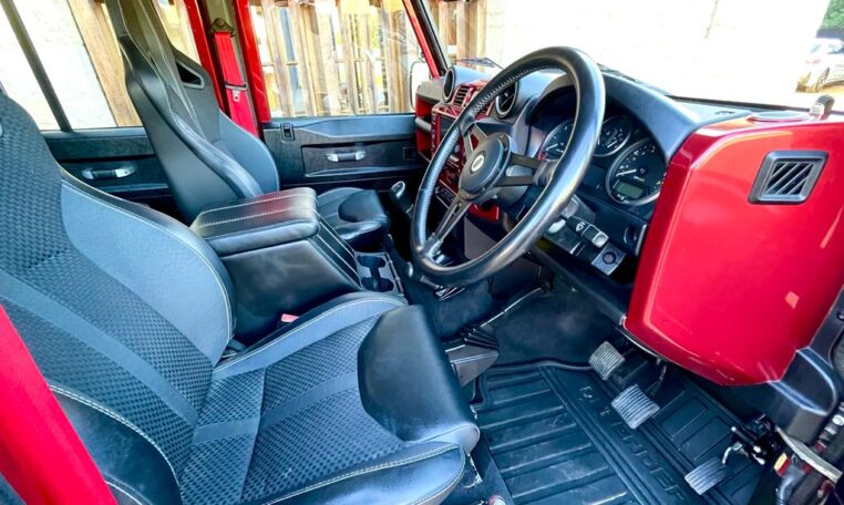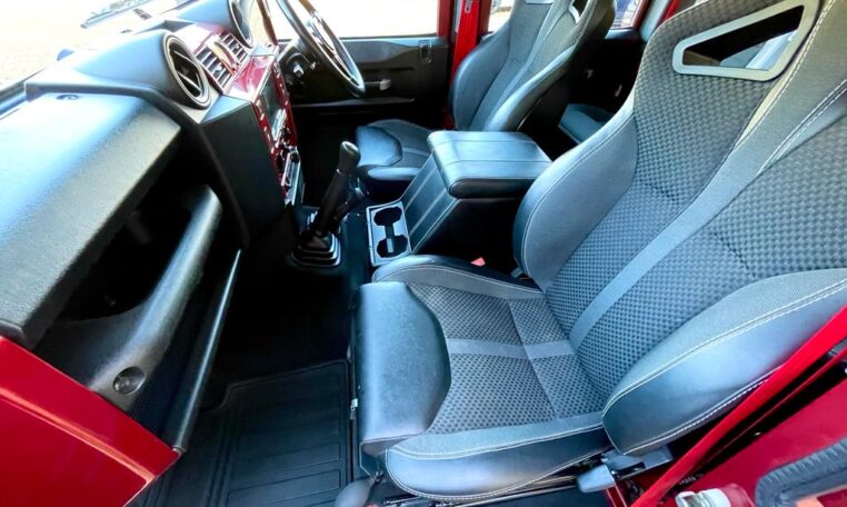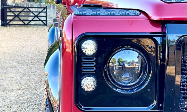 Reconfigured dash panel encompassing body colour finish with contrasting black leather pods and grab handle together with sports comfort seats, 18” black multi spoke alloy wheels on BFG AT tyres, LR black checker plate kit, our sports grille, Santorini black wheel arches, roof and light surrounds encompassing LED head lights and white light kit.