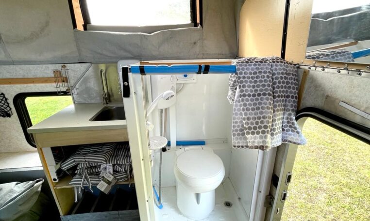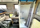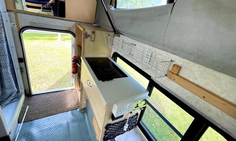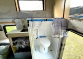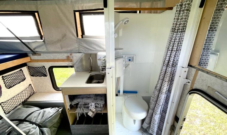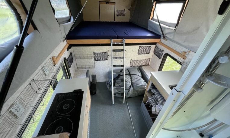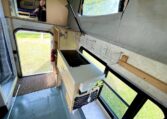 In the camper we built a really trick telescopic shower and toilet cubical with further storage cupboards, cooker hob and sink unit.