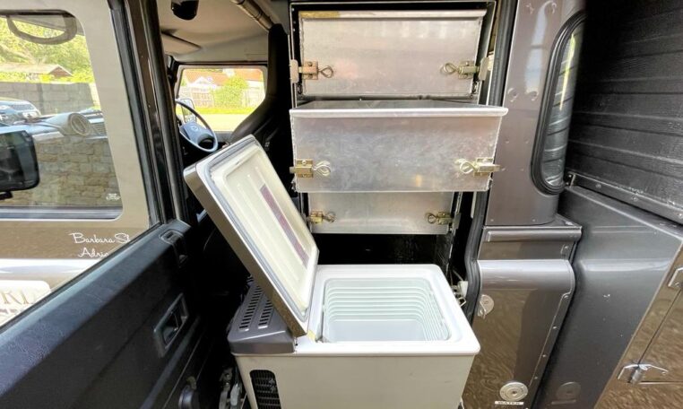 Internally there is further storage draws and fridge behind the passenger front seat, two spare wheels and associated tools.