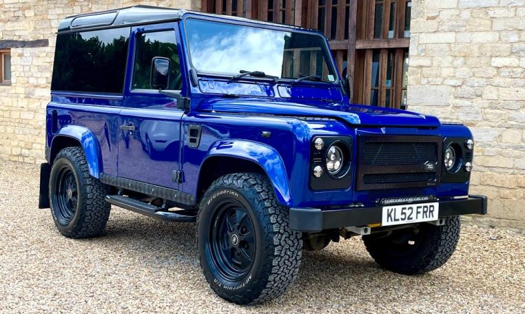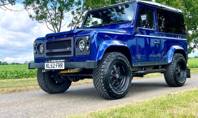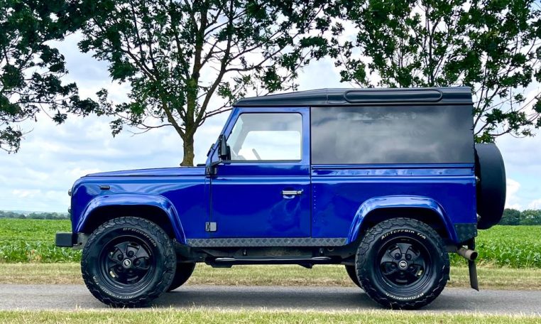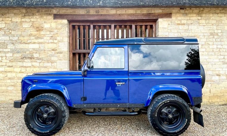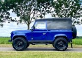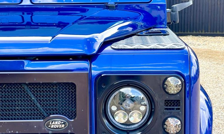 We are pleased to offer this striking looking LR 90 Defender which has previously undergone extensive works. Having recorded 12,467 miles since the rebuild we can all see what is a very individual 90 wearing RR SVR Estoril blue metallic paint finish with contrasting santorini black roof, panoramic glass, black LR checker plate kit, 18” classic retro alloy wheels on BFG AT tyres, white light kit with LED headlights, front bumper mounted Lazer light, graduated tinted glass, rear HD spare wheel carrier.